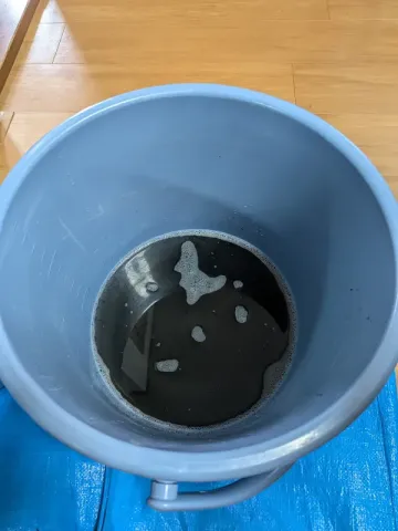 見せてくださった掃除後の水にたくさん汚れが浮いていました。
