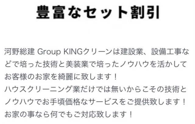 ご覧頂きありがとうございます。河野総建Group KINGクリーンです。KINGクリーンでは河野総建で培った建築の技術、ノウハウで安心安全なハウスクリーニングをご提供致します。また大手化粧品メーカー様や介護施設様、幼稚園などで美装作業をしております。赤ちゃんやペットに優しい施行を実施しております。また女性スタッフ同行、夜間作業も対応可能です。複数台もご対応可能です。よろしくお願い申し上げます。