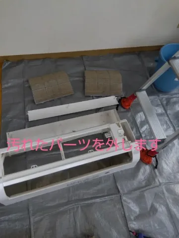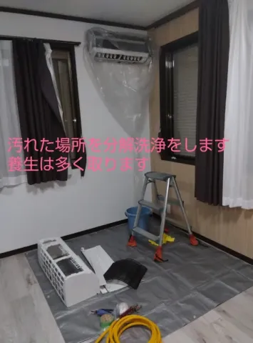 エアコン真下は特に汚水が飛び散る可能性があります。弊社は事前に用意した養生シートを引き作業終了後に確認してもらいます。