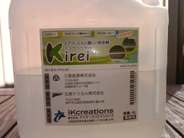 通常のエアコン洗浄剤は洗浄力を担保するため、水酸化ナトリウムを含む強アルカリの性質をもっています。一方でエアコンのアルミフィンを腐食させたり、人の気管支を刺激したりするリスクがあります。その問題を解決するため、強アルカリ性かつ、水酸化ナトリウムを含まない、エコ洗剤kireiを使用しています。通常は有料オプションになるエアコン、人、ペット、環境に優しいエコ洗剤ですが、追加料金なし=基本作業内でご提供します。