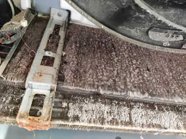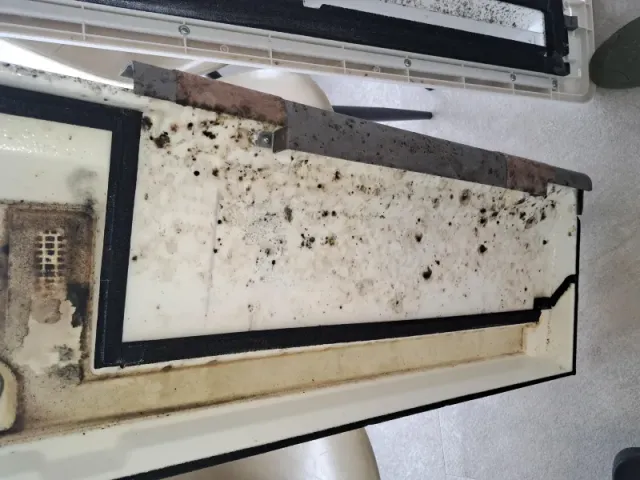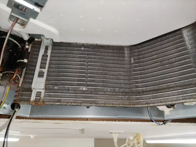 ペットショップ(トリミングサロン)のため、犬の毛を大量に吸い込んで、熱交換器を覆っていました。天井埋込用の高圧洗浄機で一生懸命落としました。