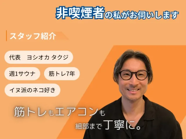 当店のページをご覧いただき、誠にありがとうございます。クールデンキ店長の【吉岡拓士】と申します。丁寧な対応で快適な空間づくりのお手伝いをさせていただきます。
