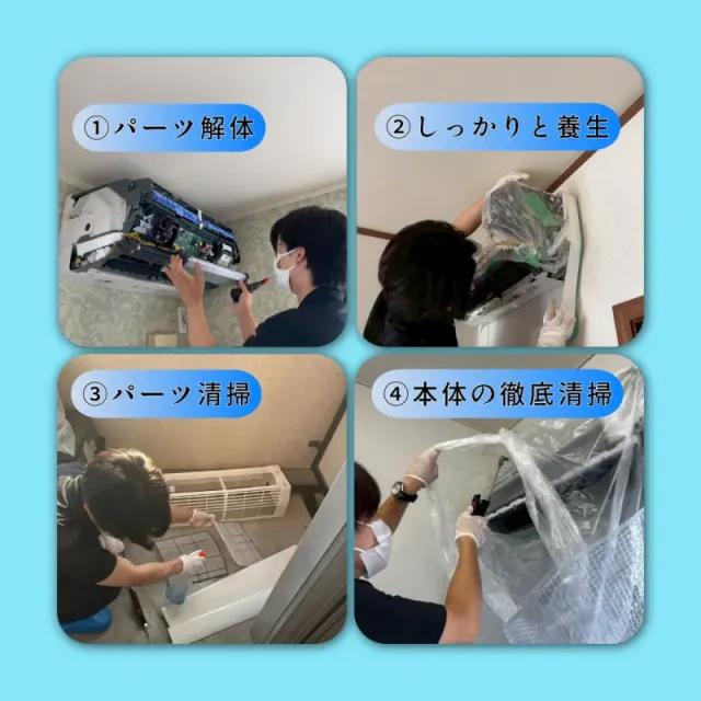 ・おそうじ機能付きエアコンの場合は、必ず事前にお知らせください。・カバーの洗浄スペースとして、浴室またはベランダを使用させていただきます。・作業にあたり、電気および水道をお借りいたします。・エアコン下は作業スペースとなるため、荷物や家具がある場合は事前にご移動をお願いいたします。・高所設置のエアコンについては足場が必要となる場合があるため、ご予約時にご連絡ください。・取り外し不可、動作確認ができない、異音や故障があるなどの場合は、作業をお断りさせていただくことがございます。・専用の機材および洗剤を使用いたしますが、経年劣化等により塗装が剥がれる可能性がございます。・変色や染み付きなどの汚れについては、完全に除去できない場合がございます。・製造から10年以上経過している機器については、保証対象外となる場合がございます。