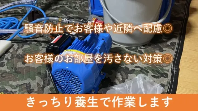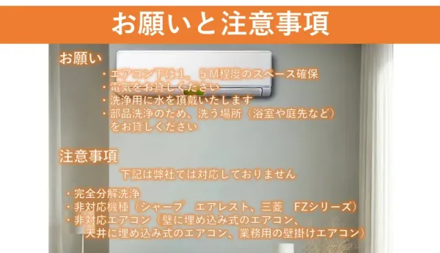 ・エアコン下のスペース確保をお願いいたします(エアコン下に脚立を立てての作業になりますので、1.5M程度必要です)。どうしても難しい場合はご相談ください。