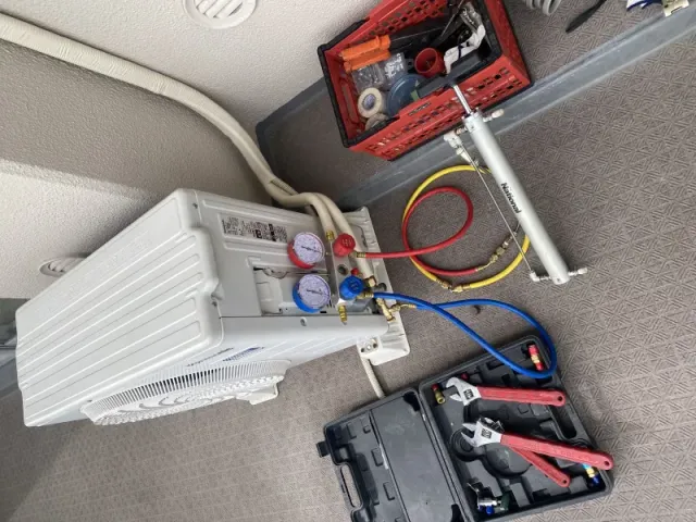 室外機の取り付け後、真空ポンプでエアパージ(真空引き)