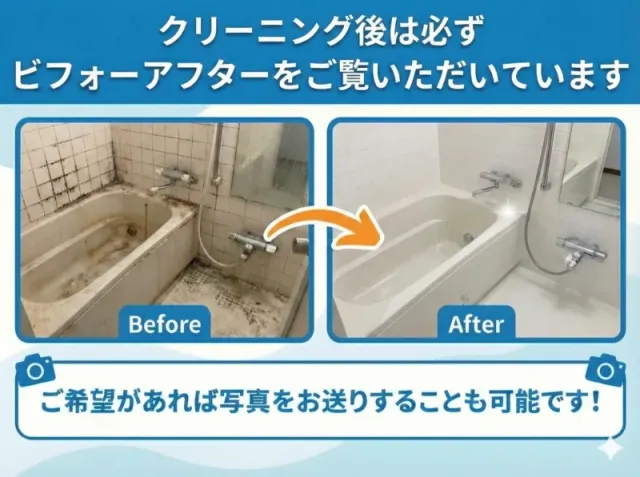 ご予約後に事前確認を行い、当日は作業内容をご説明したうえで丁寧に清掃を実施いたします。作業中も必要に応じて状況をご報告し、完了後は仕上がりをご確認いただきながら内容をご説明いたします。ご納得いただいてから終了となりますので、初めての方でも安心してご依頼いただけます。
