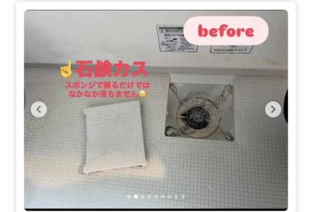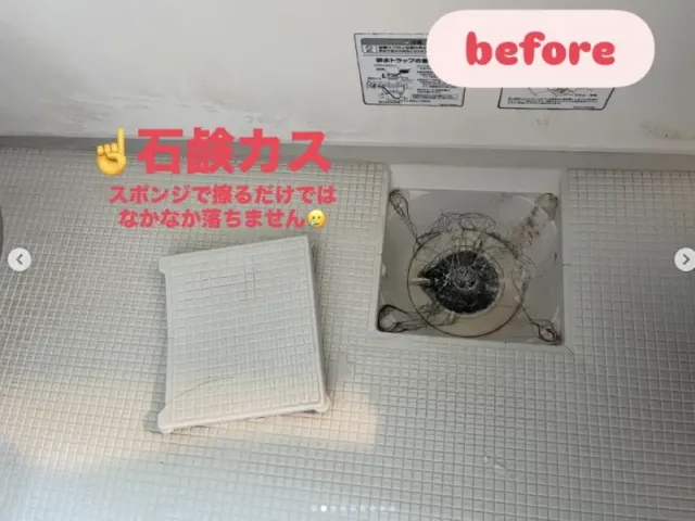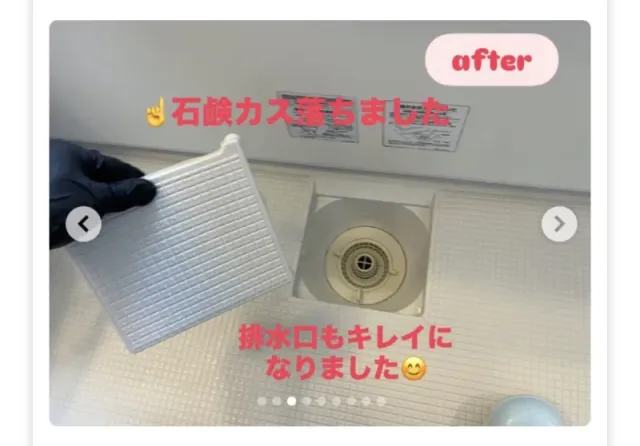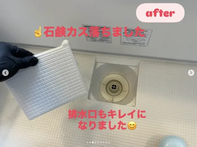 びっしり付着した長年の石鹸カスや、排水口のカビやヌメリもこの通りキレイになりました!