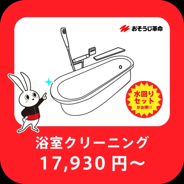 浴室は水アカやカビなどのご家庭では 落としきれない頑固な汚れがたまりやすい場所ですよね。 浴室は目に見える汚れだけではなく、 目に見えない細菌やウィルスなどもたくさん存在し、 汚れの種類も非常に多い場所です。 おそうじ革命では、 独自に開発した専用の洗剤を用いて 浴室全体を徹底的にピカピカに! 真似できないプロのおそうじ技術、 ぜひご体感ください!