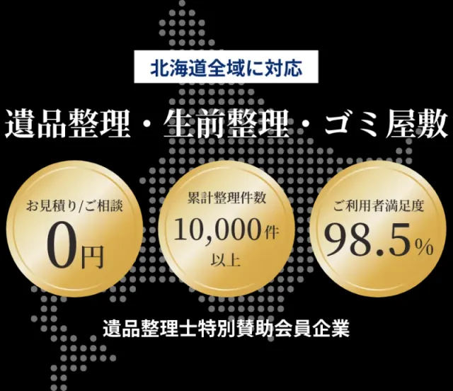札幌市内はもちろん、小樽・石狩・千歳・恵庭など北海道全域の幅広いエリアに対応しています。遠方からのご依頼や、急なご事情にも柔軟にご相談に応じることができるため、引越しや空き家整理といったさまざまなシーンでご活用いただけます。
