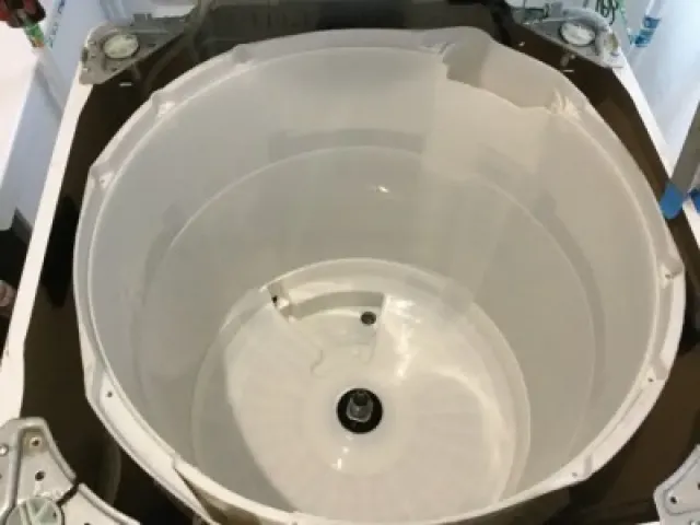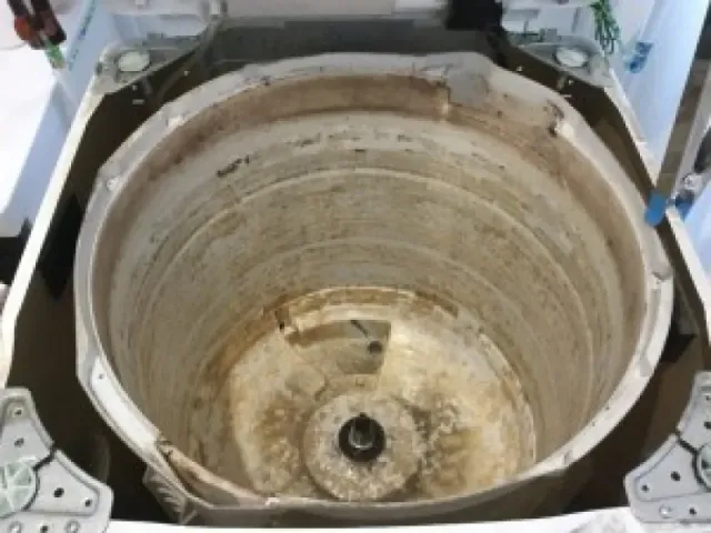 「縦型洗濯機を分解し、普段は手の届かない槽の裏側まで徹底洗浄。黒カビや洗剤カスをしっかり除去し、安心して快適にお使いいただけます。」