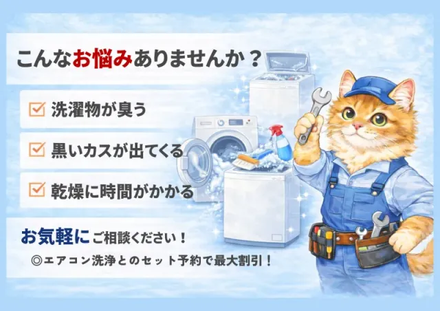 はじめまして!ニャンコクリーニングの鍵山と申します。これまで エアコン修理・取り付け・クリーニングを15年以上やってきました。もともと大工の経験もあり機械や住宅設備のことは安心してお任せください。このたび厳しい研修を経て、 洗濯機クリーニング を始めることになりました!名前は「ニャンコクリーニング」ですが…実は猫は飼っていません!笑ページには注意事項や、ご予約前に確認いただきたいことがたくさん書いてあります。少し面倒に感じるかもしれませんが、当日の作業をスムーズに行うために大切なことです。どうかご協力よろしくお願いいたします。「丁寧・安心・わかりやすい」を大事に、誠実に対応してまいります。どうぞよろしくお願いします!